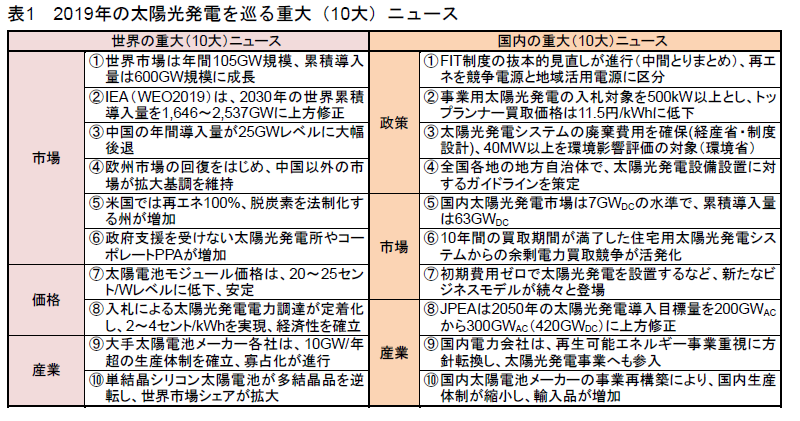 2010年代が終了し、2020年代が始まる。2010年代の10年間、世界の太陽光発電市場は年率30%を超す劇的な発展を遂げた。2010年代の最終年となる2019年の主な太陽光発電の動きは、表1に示すように、海外では政府支援を受けない太陽光発電の導入が進み始めている。2020年からはパリ協定の本格運用が予定されており、太陽光発電の安定的な発展が定着することとなろう。