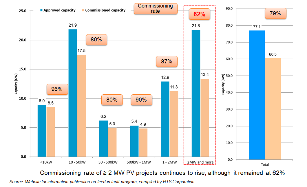 The Ministry of Economy, Trade and Industry (METI) published that as of March 31, 2022, cumulative approved capacity of PV projects under the FIT program was 77,056 MW, or 2,615,961 projects and cumulative commissioned capacity was 60,536 MW or 2,449,200 projects*. Compared to December 31, 2021, approved capacity increased by 705 MW and commissioned capacity increased by 1,193MW, brining commissioning rate (rate of start of operation) by capacity to 79%. Of these, the commissioning rate of ≥ 2 MW PV projects continues to rise, although it remained at 62%.