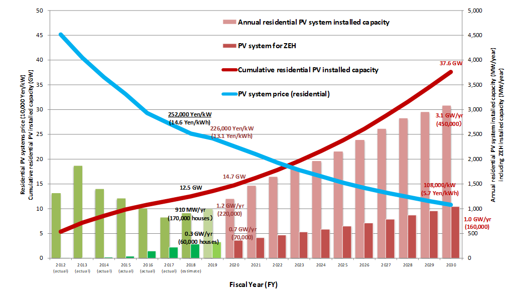 However, in 2019, the “post-FIT” PV systems started to appear ahead of the industrial sector and the business competitions over residential PV systems are intensifying once again, including storage battery systems. Together with the development of net zero energy houses (ZEH) and an increasing demand for resilience, the residential PV market in Japan is expected to grow further. There is no doubt that the residential PV systems will contribute to the infrastructure of local communities as distributed energy systems both for newly-built and existing houses, driven by the new business models such as Zero Yen installation (PV system installation at not initial cost) and proposals of PV systems for self-consumption.