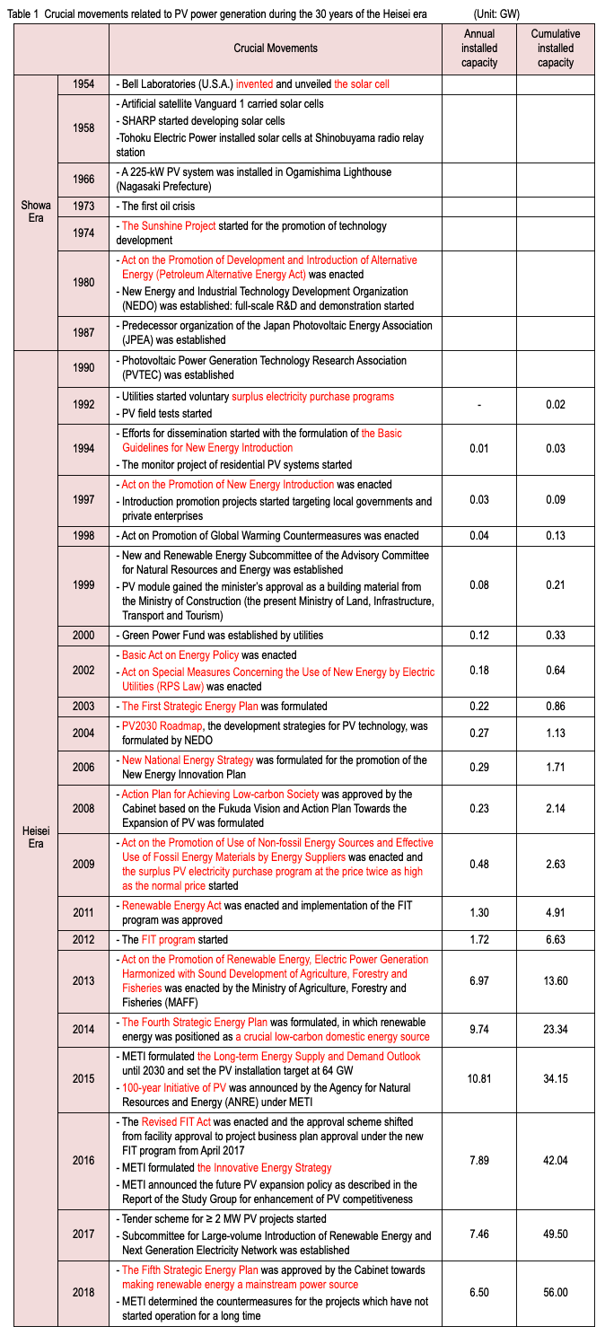In the Showa era, the solar cell was invented. While the solar cell was used as a special power source, its development and demonstration as energy technology were implemented under the national project, the Sunshine Project. With the start of the Heisei era in January 1989, PV shifted from the technology development to the early dissemination stage. Along with the exploration of its use as energy, PV made a dramatic progress to gain a position in 2018 as a future mainstream power source. Although the focus of the energy policies shifted to nuclear energy in the first half of the 30 years of the Heisei era as shown in Table 1, the importance of new and renewable energy was recognized and the surplus PV electricity purchase program started in 1992. As the Basic Guidelines for New Energy Introduction was approved by the Cabinet in 1994, the subsidy program for residential PV systems was introduced. Thereafter, the Act on the Promotion of New Energy Introduction (1997), the Basic Act on Energy Policy (2002) and the Act on Special Measures Concerning the Use of New Energy by Electric Utilities (RPS Law, 2002) were enacted sequentially and the dissemination of PV accelerated. During this period, Japan had been the global leader in the annual installed capacity until 2003 and in the annual PV production amount until 2006 and became a model country in PV dissemination. However, with the expiry of the subsidy program for residential PV systems in 2005, Japan’s installed capacity stagnated.