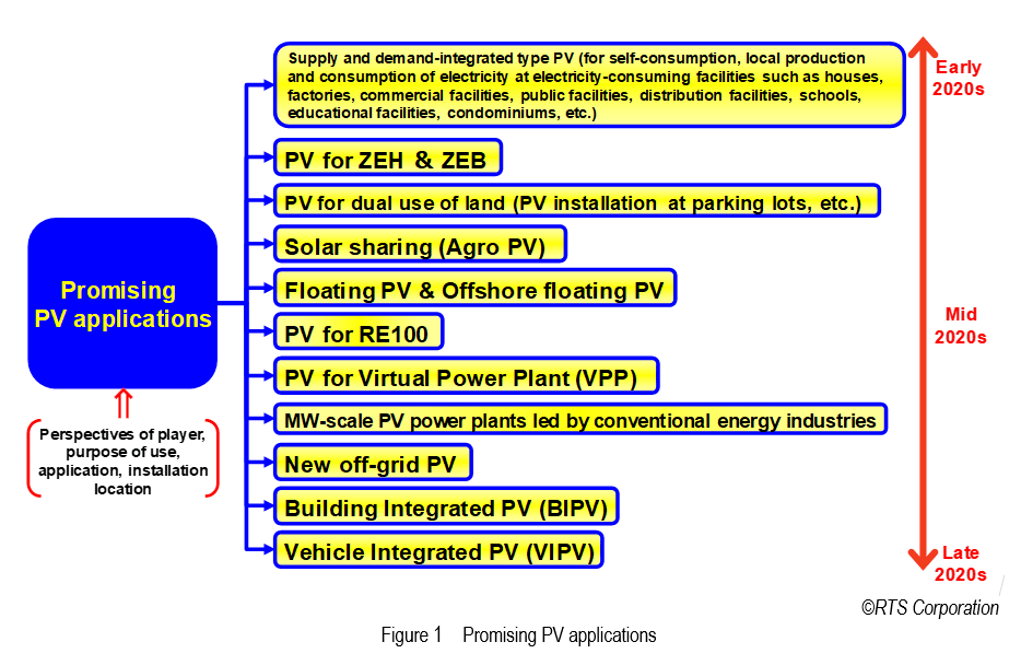 Meanwhile, as for MW-scale PV projects, there is little suitable land and the market is limited since the first priority is the economic efficiency. New installations of PV power plants are estimated in locations where less land development cost and grid interconnection cost are needed, for replacing conventional power plants, or for achieving RE 100, etc. Furthermore, growth is expected in new markets that developed in the latter half of the 2010s such as floating PV system and agro PV (solar sharing, or PV system installation on farmland while continuing agricultural activities), etc. by gaining experiences through deregulation and installation support of related ministries and agencies. In addition, independent power source market, vehicle integrated PV (VIPV) market, and building integrated PV (BIPV) market are also expected to grow from 2025 onwards through the progress of technology development which will expand the application areas. The PV applications in the 2020s will expand in various fields and is expected to spread in the society as shown in Figure 1..