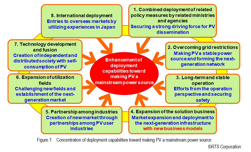 The enhancement of deployment capabilities as the Y axis here means the enhancement of efforts on the following eight essential deployment capabilities as shown in Figure 1: 1) Securing a strong driving force for PV dissemination through combined deployment of related policy measures by the national government; 2) making PV a stable power source by overcoming grid restrictions and forming the next-generation network; 3) establishing PV as a mainstream power source from the operation perspective, through long-term and stable operation; 4) market expansion through expansion of the solution business and enhancement of deployment to the next-generation infrastructure; 5) creation of new market through the partnership between the PV industry and the industries utilizing PV; 6) establishment of the next-generation market by challenging new fields and expansion of utilization fields; 7) creation of independent and distributed society with PV systems for self-consumption through technology development and fusion of technologies; and 8) international deployment by utilizing experiences in Japan. To make PV a mainstream power source, it is essential to comprehensively enhance these efforts.