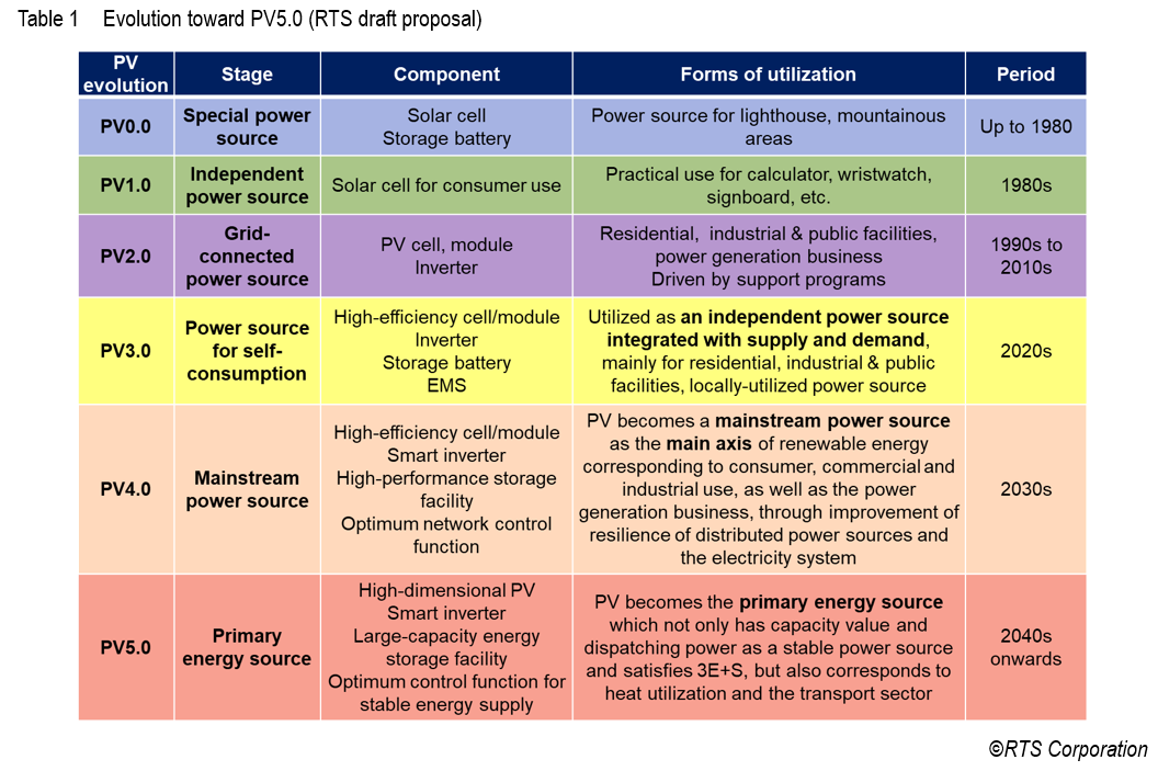 It is expected that the PV power generation will evolve as shown in Table 1. The forms of PV utilization will evolve from PV0.0 to PV5.0 depending on the stage of development as a power source.