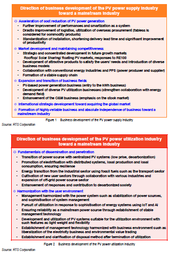 Toward creating a renewable energy-oriented economic society as mentioned above, it is essential for the industry to have a strong commitment to actually expand renewable energy as a business. PV, along with hydro and wind, is an important renewable energy source for Japan to become a renewable energy-oriented country. The industrial sectors supporting the PV industry can be broadly classified into the one suppling PV power and the one utilizing PV power. The former sector, which once was the world’s largest, is now under a severe global competition, whereas the latter sector, which is a new industrial sector which is expected to grow significantly hereafter. Activities toward making PV power generation a mainstream power source are just starting in full scale and the formation of the industry through integration of both the supplier and the user industries will be the linchpin. Taking the 2020s as a great opportunity, the PV industry consisting of these two sectors should aim to become a key industry through partnership between the industry and the government, and is expected to promote business development as shown in Figure 1 and Figure 2. Japan should once again lead the world as a country of renewable energy-oriented economic society.