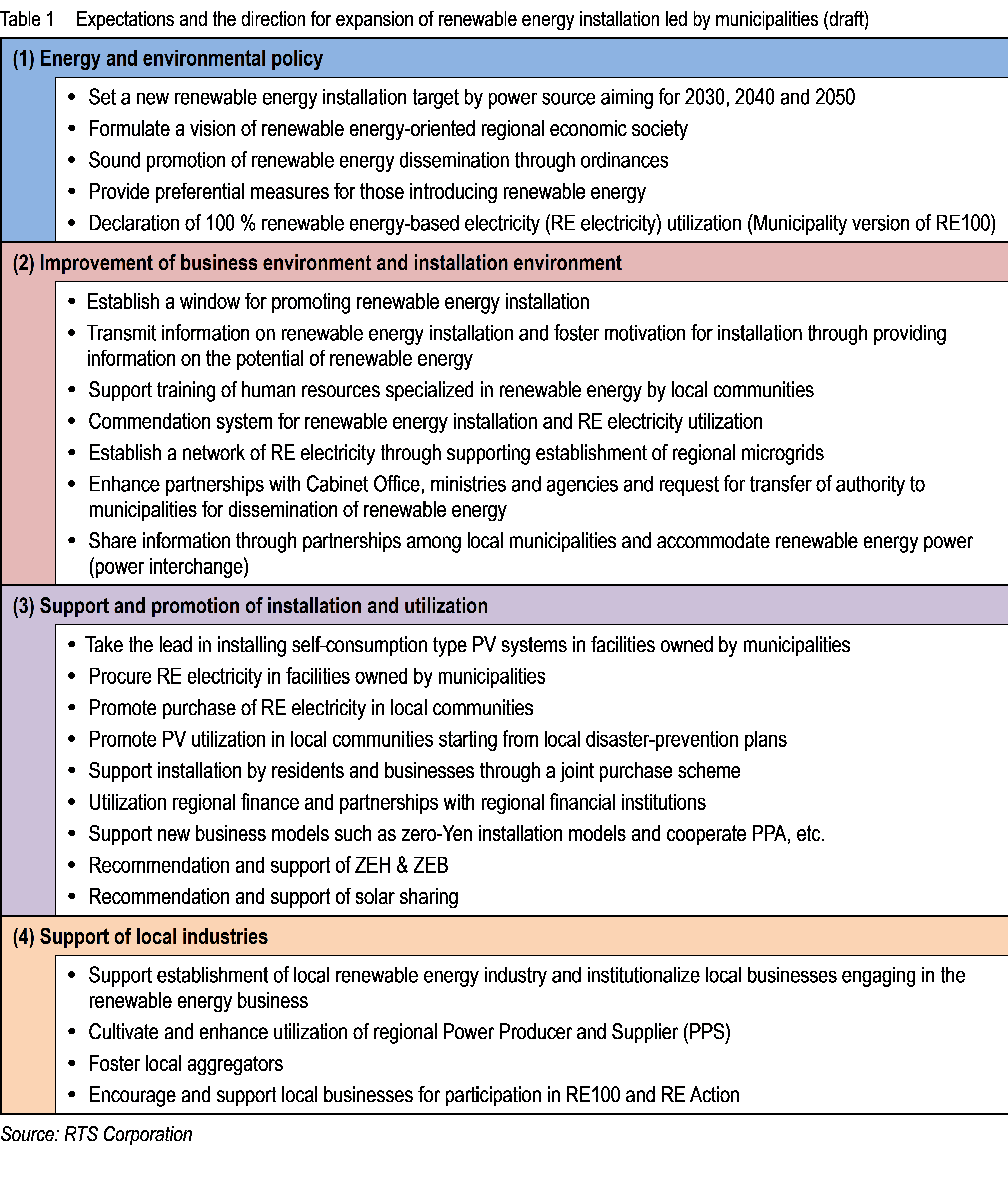 Municipalities have so far promoted dissemination of renewable energy in a passive manner with support from the Cabinet Office, ministries and agencies based on national policies. However, from now on, municipalities will be able to promote local production and local consumption of RE electricity with local industries and residents in an active manner. Utilization of renewable energy need to be progressed responding to local characteristics while classifying renewable energy power sources into competitive power source and locally-utilized power source responding to their characteristics. To achieve this, it is important for each municipality to take the central role in promoting installations according to the status quo of each area. Especially, PV can be introduced in any area of Japan, and is the most suitable for local energy supply as the main axis of distributed power sources.