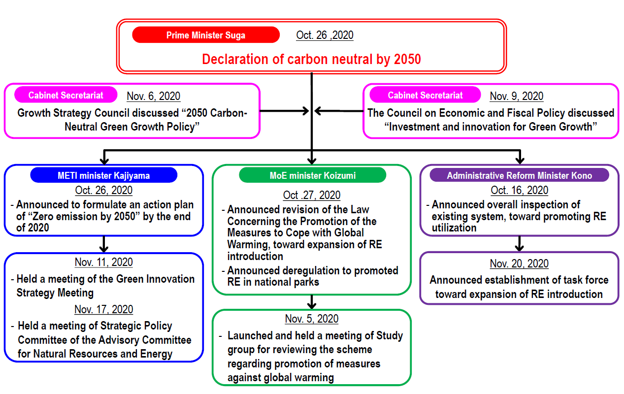 The declaration of “Aiming to realize a carbon-neutral decarbonized society by 2050” by Prime Minister Yoshihide Suga made a great impact in Japan and abroad. November 2020 was a dramatic month for related ministries and agencies responding to realize “Zero emissions by 2050,” as per the orders from ministers as shown in Figure 1. Furthermore, it is expected that the US will make a great turn towards a “Decarbonized society by 2050” raised by the Democratic Party with the comeback to the Paris Agreement due to Joe Biden becoming the next president. The global trend of decarbonization will rapidly accelerate.