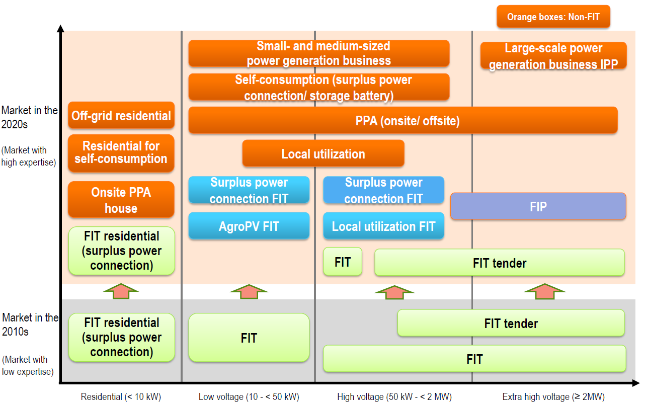 In the future, active PV installation by power consumers and expansion of renewable energy procurement are expected. The PV industry must move away from business deployment in the 2010s that is dependent on the FIT program, and create a new business model that has high economic rationality combining equipment procurement from around the world, distribution rationality, shortening of construction period, utilization of finance method, etc. Establishment of independent business deployment such as self-consumption type PV which will be the future growing marketand PPA model (offsite/ onsite) shall be accelerated.