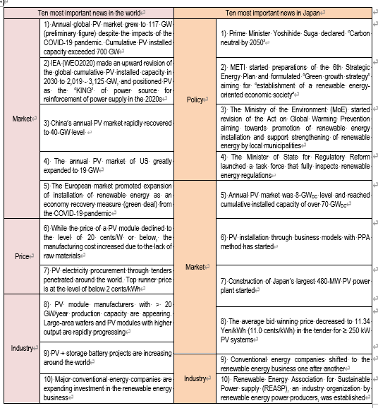 The 2020s have begun and the first year of the decade has ended. The world has been pressed with measures to tackle the expansion of COVID-19 pandemic, which caused unmeasurable damages on the global economy and daily life. However, there emerged a global trend of economic reconstruction based on the idea of “green recovery,” towards the recovery of the global economy. Year 2020 became a year for the world, including the US and China, to move towards realization of a decarbonized society. The major PV-related activities and movements in 2020 are shown in Table 1. IEA positioned PV as the “KING” of power source for reinforcement of power supply in the 2020s and the stable PV development is close to taking root.