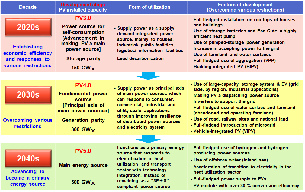 As for the future deployment in the 2020s, the economic efficiency that has been promoted will be further improved and PV as PV3.0 will step up to become a power source for self-consumption. The 2020s will be an important decade that will lead to the development in 2030 onwards, through acquiring trust and support from the nation by securing economic efficiency as a distributed power source and starting to overcome other issues. In the 2030s, all of the issues will be solved, and it will be a decade for PV to shift to the principal axis of main power sources as PV4.0. In the 2040s, PV will not only remain as the mainstream power source but also correspond to electrification of heat use and become the power source of the transportation sector by integration of technologies such as hydrogen utilization, and it will be a decade of challenge for operation as a primary energy as PV5.0. Upon setting the target for PV installed capacity, although there are external factors such as power storage and use of farmland, etc., the dramatic development potential as shown above should not be underestimated. The PV industry shall aim for early independence, and work on overcoming the issues through the partnerships among the industry, government and academia. It shall aim evolve itself in phases: In the 2020s, it shall become an industry that leads others toward carbon neutrality; In the 2030s, it shall become an industry that deploys zero energy services; and in the 2040s, it shall become a basic social infrastructure industry.