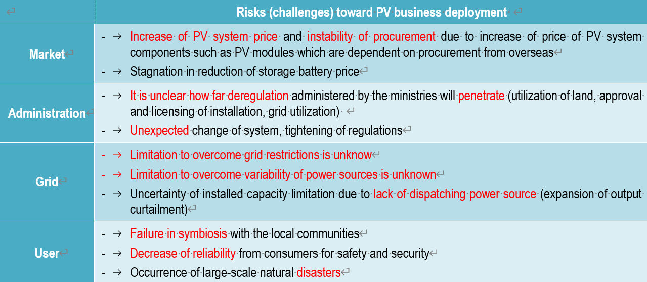 Up till today in Japan, the PV industry has been protected by the FIT program and achieved PV installation of 60 GW scale. Although PV has not reached the international price, it has achieved a cost reduction of 70 % from the cost at the start of the FIT program. Hereafter, PV is required to achieve dramatic development as the next generation energy industry aiming towards creation of a renewable energy-oriented economic society. Nonetheless, in terms of installation exceeding 100 GW, PV will be facing challenges that cannot be overcome by PV technology alone, including location and integration with power storage, and it will be necessary to prepare to overcome the risks (challenges) over PV business deployment, as shown in Table 1.