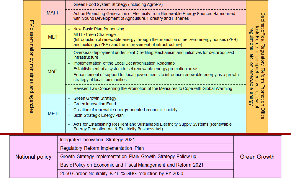 Among the policies and measures administered by concerned ministries and agencies as well, a policy to promote new developments over renewable energy was presented. As for the PV dissemination, a new form of PV utilization toward “decarbonization” is about to be added, aside from the conventional utilization of PV as power source. The Ministry of Economy, Trade and Industry (METI) has been promoting introduction expansion of renewable energy under its energy policy so far, and currently, it is speeding up formulating the sixth Strategic Energy Plan which covers acceleration of making renewable energy a mainstream power source and the upward revision of the target PV installed capacity, aiming toward 46 % GHG reduction in FY 2030. Furthermore, METI revised the Green Growth Strategy which was formulated in December 2020 focusing on the perspectives of industrial policy, and reorganized the industrial structure, positioning PV as the next-generation renewable energy source of the energy-related industries. The next-generation power management industry, the next-generation thermal energy industry and the material industry have been newly added.
