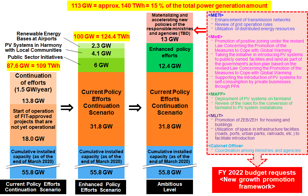 Previously, the Ministry of Economy, Trade and Industry (METI) has been responsible for the development of energy policy and the introduction of renewable energy. However, with the expansion of the introduction of distributed power sources, mainly PV power generation, to the current scale, it will be difficult for METI alone to manage further expansion. Now that the “achievement of a 46 % GHG reduction” is added to “making renewable energy the main power source,” it will be impossible to achieve the target of more than 100 GW installation unless related ministries and agencies such as MoE, the Ministry of Agriculture, Forestry and Fisheries (MAFF), and MLIT share the responsibility of promoting dissemination of renewable energy in the areas of respective legislation, regulations, systems, and measures, rather than relying solely on the energy policy of METI. Fortunately, related ministries and agencies started to participate in the formulation of the Sixth Strategic Energy Plan. Each ministry is expected to address the following to promote the introduction of PV system; the enhancement of transmission networks, review of grid operation and self-wheeling rules, and utilization of distributed energy resources by METI; promotion of positive zoning which actively supports development of renewable energy projects by setting up zones for the promotion and taking the initiative in introducing PV systems to publicly owned facilities and land as part of the government’s action plan under the revised Law Concerning the Promotion of the Measures to Cope with Global Warming, and supporting the introduction of PV systems for self-consumption by private businesses through PPA by MoE; deployment of PV systems on farmland and review of the rules for the conversion of farmland to PV system installations by MAFF; and promotion of ZEB/ZEH for housing and buildings, and the utilization of space in infrastructure facilities (roads, ports, urban parks, railroads, etc.) to facilitate introduction by MLIT.
