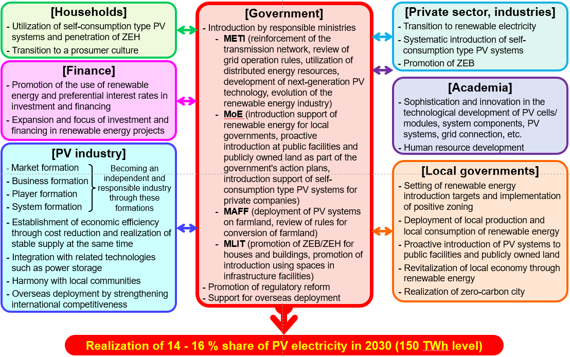 “One plus three framework” of responsible ministries with METI as a main player that was newly formed by the engagement of three ministries was established through the formulation of the Sixth Strategic Energy Plan. This framework will become indispensable as it can show that the nation intends to expand the PV introduction and improve the foreseeability and effectiveness of over 100 GW PV introduction. The framework also makes it possible to put together and use the laws, systems, policy measures, regulatory reforms and budgets and pave the way for the expansion of introduction in the fields and areas where PV power generation has not been introduced so far. The enhancement of continuous collaboration of the four ministries regarding the introduction will be important in the future.