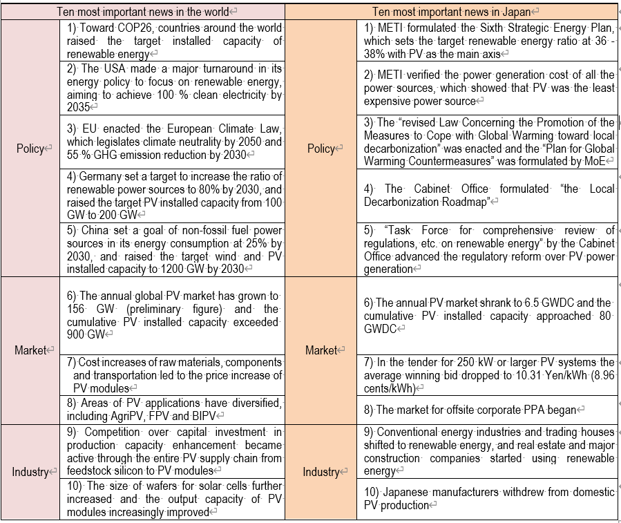 Table 1 Ten most important news related to PV power generation in 2021
