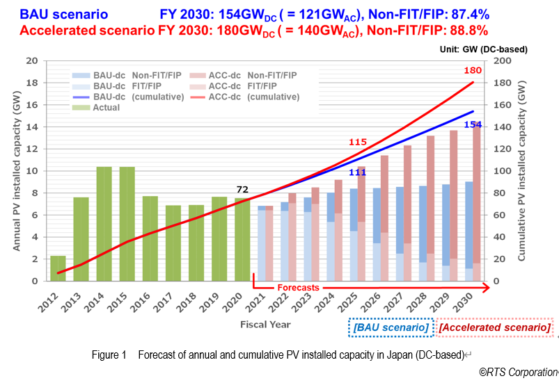 Assuming that the cost of PV modules and storage batteries will decrease reflecting international prices as the responsible ministries and agencies begin to introduce PV power generation, as shown in Figure 1, the annual and the cumulative PV installed capacity in Japan in 2030 will be 9.0 GWDC (6.7 GWAC) and 154 GWDC (121 GWAC), respectively under the BAU scenario and will increase to 14.7 GWDC (10.6 GWAC) and 180 GWDC (140 GWAC), respectively under the accelerated scenario. Under the BAU scenario, it was assumed that the ambitious level target of 117.6 GWAC in the “Sixth Basic Energy Plan” would become a “reality” with the all-out efforts throughout Japan. Under the accelerated scenario, it is expected that PV introduction will further grow as the introduction environment will greatly improve and progress by actively strengthening and speeding up various promotion and support measures, solving the issues through technological development, creating markets with new business models, and establishing conversion to green power. The introduction will accelerate from the viewpoint of emphasizing energy security as well. Until now, most of the PV installations were supported by the FIT program, but the introduction of non-FIT/FIP PV systems with new business models such as PPA has begun, and from 2025, the share of non-FIT/FIP PV systems is expected to grow rapidly, reaching just under 90% by 2030.
