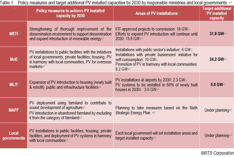 The support scheme for PV power generation will shift from the Feed-in Tariff (FIT) program, which allows power producers to sell all electricity they generate at a fixed price, to the Feed-in Premium (FIP) program, which provides power producers with a market-linked premium while allowing them to sell electricity on the market by themselves. The market will enter the stage where PV is integrated into the electric power market with a responsibility for supply. The dissemination environment for PV power generation will change significantly due to the transition to the new support scheme. In the Sixth Strategic Energy Plan, in addition to METI, MoE, the Ministry of Land, Infrastructure, Transport and Tourism (MLIT), and the Ministry of Agriculture, Forestry and Fisheries (MAFF) will promote measures to expand the PV introduction by making full use of measures, legal systems, regulatory reforms, etc. under the jurisdiction of these ministries as “responsible ministries”, as shown in Table 1. By adding measures and legal systems of each responsible ministry and agency based on the market that has been formed with the support of the FIT program so far, it will be possible to expand the PV introduction to the markets where the PV installations had been limited with the FIT program alone.