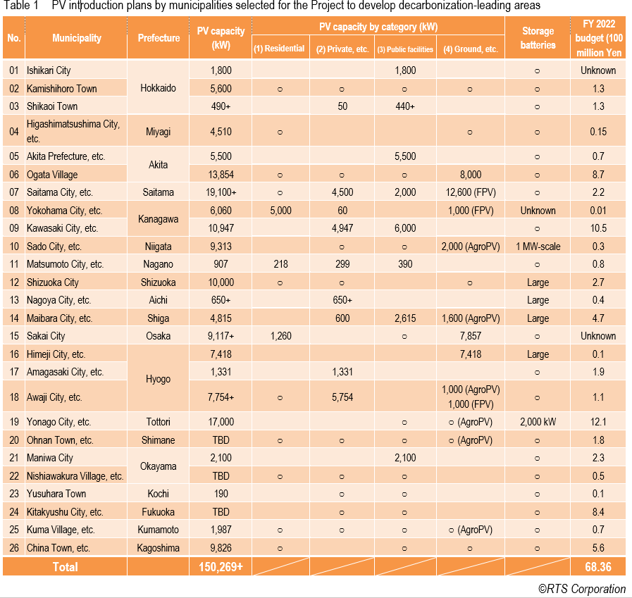 Introduction of renewable energy intensively in the regions of Japan by local governments is starting, which was adopted as part of the “Development of leading areas of decarbonization” promoted by the Ministry of the Environment (MoE) from FY 2022. In contrast to the PV introduction under the FIT Act so far, a new form of introduction based on the revised Law Concerning the Promotion of the Measures to Cope with Global Warming is about to be born. Under the FIT Act, the PV introduction was expanded through business plan approval on an individual basis, but in the project of leading areas of decarbonization, it will be a comprehensive and intensive PV introduction through the selected areas with the initiatives of local governments. The financial resources for the introduction will change from the renewable energy surcharge paid by electricity consumers to the renewable energy promotion grant established based on the revised Act on Promotion of the Measures to Cope with Global Warming.
