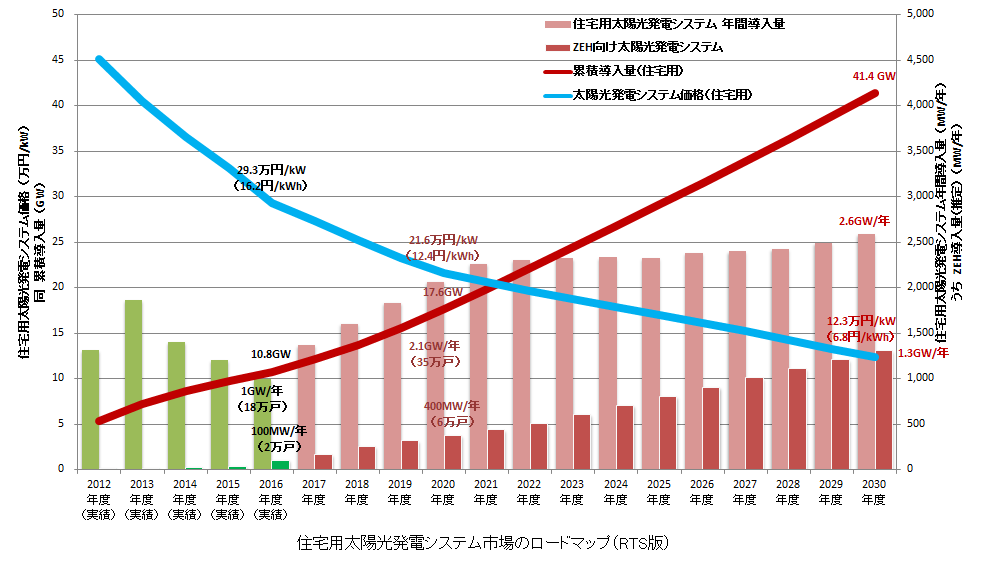 資源総合システム(RTS)が想定する「住宅用太陽光発電システム市場ロードマップ(RTS版)」では、まず住宅用太陽光発電システム価格が、2016年度末の29.3万円/kWから2020年度末には21.6万円/kW、2030年度末には12.3万円/kWへと、現状の4割程度に低減すると予想しています(導入進展ケースの場合。以下同様)。発電コスト(LCOE)についても、寿命(稼働時間)が延びることもあって引き続き下落し、現状の16.2円/kWhが2030年度末には6.8円/kWhとなります。すなわち、国が目指す「7円/kWh」というコスト目標が達成可能の見込みです。
