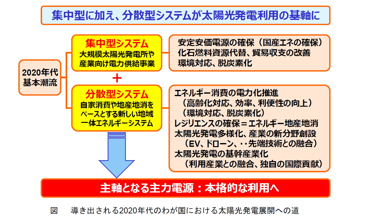 一方国内では、太陽光発電の導入が順調に進む一方、再エネの主力電源化にはまだ多くの課題が残され、制度改革等の検討が進行中です。これまで市場を牽引してきた固定価格買取制度(FIT)がフィードイン・プレミアム制度(FIP)へ移行し、従来型の集中型(大規模太陽光発電)システム市場の成長は緩やかになる見通しです。代わりに社会インフラの強靭化や地域活性化等の観点から、分散型(自家消費・地産地消)システムの需要が増加しており、分散型システムの活用の場を拡大することが2020年代の日本の太陽光発電市場の基本潮流となります。