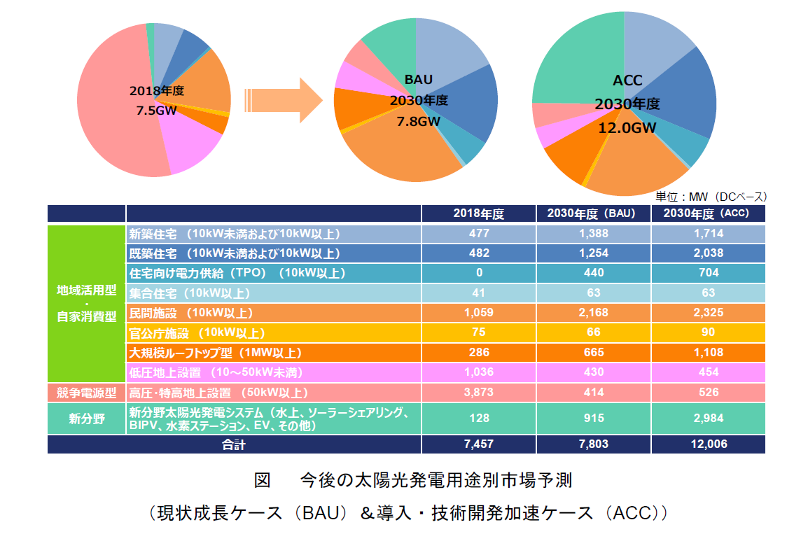 このような潮流に加え、太陽光発電利用の高度化・多様化等が進むため、弊社は日本の太陽光発電システムの年間導入量は2018年度の7.5GWから2030年度には7.8GW(現状推移ケース、BAU)、~12GW(加速ケース、ACC)へ成長し、その内訳においては自家消費・地域活用の分散型が支配的となると予測しています。加速ケースでは、大規模屋根設置型および新分野での市場拡大が求められます。PV150は、上記の加速ケースの実現を目指しています。