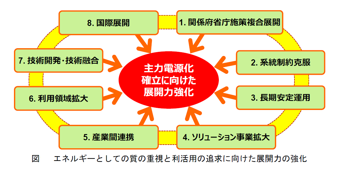 このため、PV150の達成後も、その発展の勢いを持続することが肝要です。弊社は太陽光発電が発展を続けるためには「展開力」の強化が重要であると考えております。「PV150 展開力」では、①関係府省庁による施策の複合展開、②系統制約の克服、③長期間安定運用、④ソリューション事業拡大、⑤産業間連携、⑥利用領域拡大、⑦技術開発・技術融合、⑧国際展開の8課題を挙げ、重点的に強化することを提唱しております。