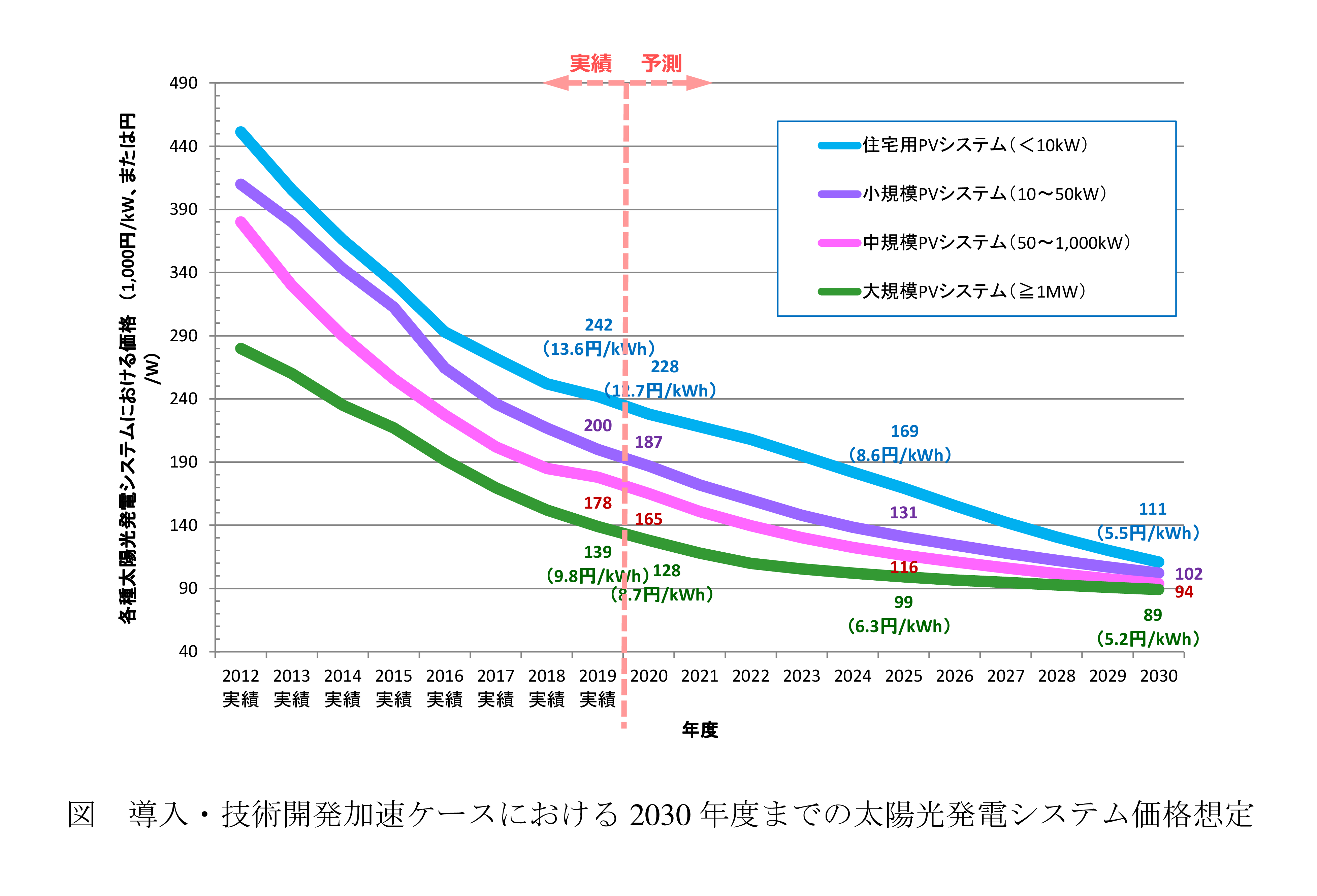導入量予測の前提として、住宅用/産業用太陽光発電システム価格が国際価格を反映し引き続き大きく下落していきます。図に示すように、「導入・技術開発加速ケース」における太陽光発電システム価格は、現状で139~242円/Wほどですが、2030年までに89~111円/Wまで低減すると予測しています。発電コスト(LCOE)試算では現状で既に9.8~13.6円/kWhとなり、系統の電気代よりも安い水準に達しています。さらに、2030年にはトップランナーで5.2~5.5円/kWhなど、回避可能原価付近まで下がることが予想されます。