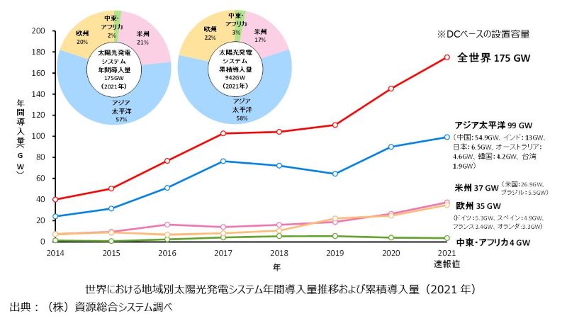 2021年は新型コロナウイルス感染症(COVID-19)流行の影響も継続しましたが、経済復興策の一環で太陽光発電をはじめとした再生可能エネルギー導入政策の強化もあり、世界全体で前年の145GWを上回る175GWの太陽光発電システムが新設されました。累積導入量は2021年末に942GWに達しました。その後、2022年6月末までに1TW(=1,000GW=10億kW)を突破しています。