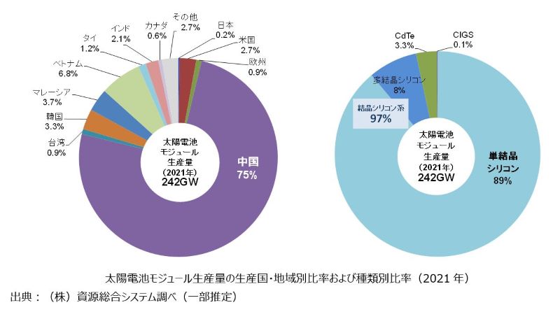世界の太陽電池生産量は、市場での需要増加に加え、中国メーカー各社が増産したことにより、2021年の太陽電池モジュール生産量は前年比36%増の242GWとなりました。生産地は引き続き、中国が支配的であるものの、貿易摩擦や新興市場での需要拡大に対応するために、東南アジアやインドでの生産も増加しました。種類別では、単結晶シリコン製品の生産量が同47%増の215GWで、市場シェアは前年の82%から89%へと増加しました。