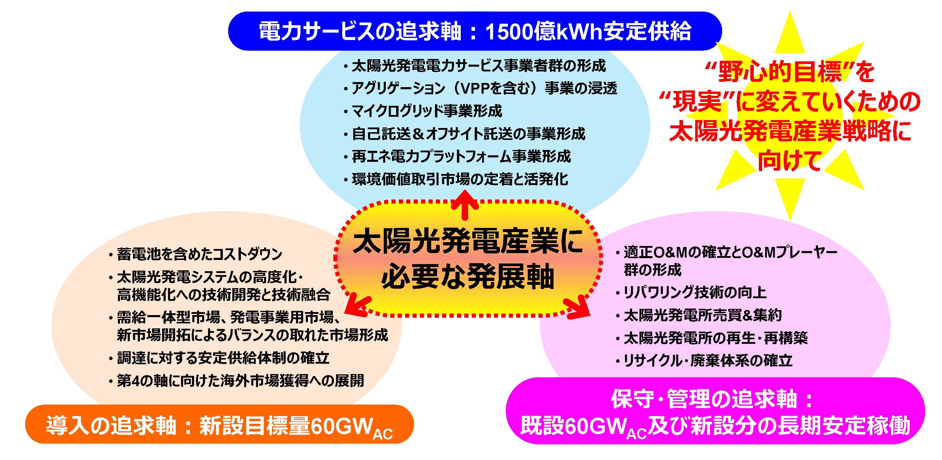 一方、太陽光発電産業は新たな国家目標達成に向けて、60GWACの新規導入を担うだけでなく、すでに導入済みの60GWACとこれからの新設分の保守・管理を担うとともに、新設および既設から生み出される120GWに向けての太陽光発電電力サービスも担うこととなる。太陽光発電産業は今日の新設を中心とする産業構造から脱却して、導入の追求に加えて、保守・管理と電力サービスの追求を同時に図れる100GWを超える安定発電を可能とする産業基盤を、計画的かつ戦略的に造り上げていかねばならない。