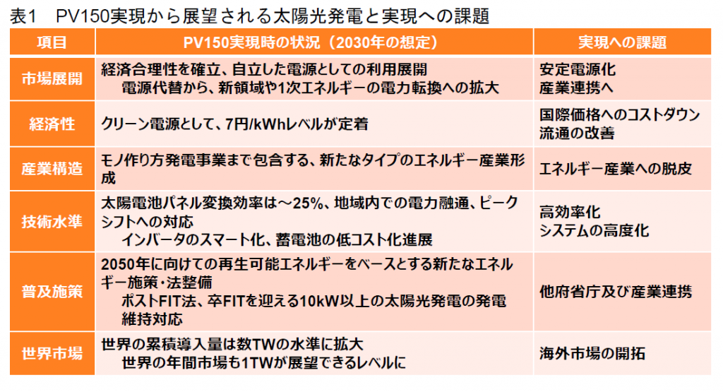 150GWの導入への取り組みによって、太陽光発電が国内総電力需要の約15%に相当する年間1500億kWhの電力を供給するだけでなく、エネルギー需給構造の転換を促進し、脱炭素社会の構築で世界をリードしていくと期待される。さらに、年間約10GW規模の安定した市場が形成され、太陽光発電産業の国際競争力を高め、海外市場の獲得にも寄与すると考えられる。表1に示すように、PV150の実現への課題を克服すると太陽光発電をめぐる新たな礎が整い、2030年以降の飛躍的な発展につなげることができよう。