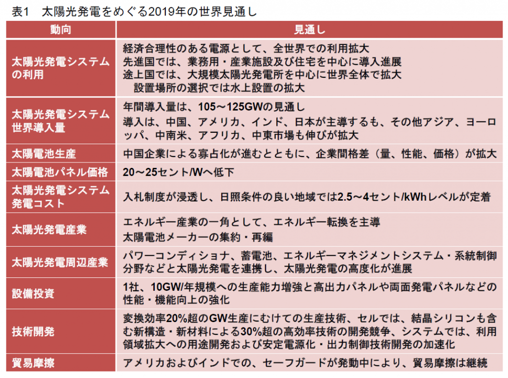 中国などの新興国メーカーの台頭により、2010年代初頭に発生した太陽電池需給ギャップは、太陽電池価格破壊を引き起こし、日米欧の多くの太陽電池メーカーが撤退に追い込まれた。しかし、これが太陽光発電導入拡大への大きな起爆剤となり、発電コストは在来型エネルギーとの競合に向けて急速な低下が始まった。2015年には、基幹電源への分水嶺となる発電コストを実現し、それ以後、世界導入量は急上昇していった。2018年には中国での太陽光発電をめぐる政策変更によって、世界の導入拡大にブレーキがかかったが、表1に示すように、太陽光発電のさらなる発展に向けた動きは胎動しており、2019年は、2020年代のさらなる飛躍的な発展に向けた準備を進める大事な1年となろう。
