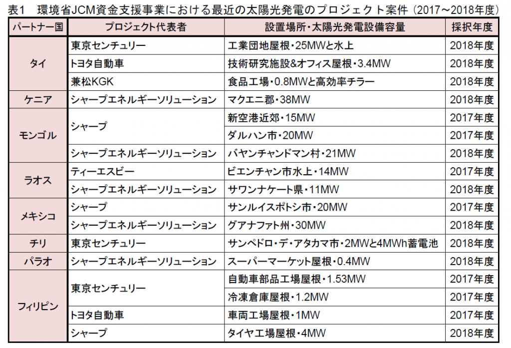 太陽光発電をめぐる海外展開は、表1に示すように、環境省による途上国への温室効果ガス削減技術展開のための「二国間クレジット制度(JCM)資金支援事業」が中心的役割を担っている。このJCM事業を通じて、MWオーダーの大規模発電所の建設や日本が得意とする建物屋根への太陽光発電の設置実績が広がっている。日本にはFIT制度開始以来、規模、用途、設置場所、設置工法、系統運用等、多様な条件/環境に対応した技術と実績が既に存在しており、これを本格成長が始まる海外市場の獲得にも反映させていくべきである。