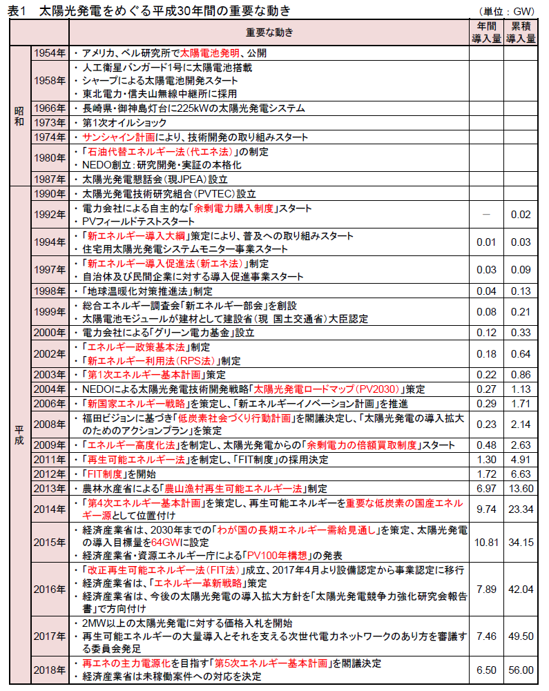 「昭和」の時代には、太陽電池が発明され、特殊電源として利用されつつ、国家プロジェクト「サンシャイン計画」もとで、エネルギー技術としての開発と実証が進められた。1989年1月に「平成」時代に入ると、太陽光発電は技術開発から初期普及段階へと移り、エネルギーとしての利用を模索しながら、2018年には将来の主力電源と位置付けられるまでに劇的な進歩を遂げた。平成30年間を振り返ると表1に示すように、前半はエネルギー政策の中心が原子力にシフトする中でも、新エネルギーの重要性は認識され、1992年には太陽光発電からの余剰電力の買取制度が始まった。1994年には「新エネルギー導入大綱」が閣議決定され、住宅用太陽光発電システムに対する補助金制度が創設された。その後「新エネルギー導入促進法(1997年)」、「エネルギー政策基本法(2002年)」、「新エネルギー利用法(RPS法、2002年)」が順次制定され、太陽光発電の普及が加速された。この間、わが国は年間導入量で2003年まで、年間生産量で2006年まで、世界No.1となり太陽光発電普及の模範国となった。しかし、2005年に住宅用太陽光発電システム補助金が終了すると、わが国の導入量は低迷期を迎えた。