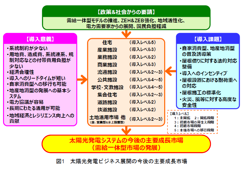 太陽光発電産業界は、このような需給一体型市場への取り組みをこれからの太陽光発電ビジネスの本流に据えて取り組むことで、自家消費と系統を活用した需給一体型太陽光発電の高度な運用モデルを確立し、発電事業に続く太陽光発電発展の第2幕を切り開いて行こう。世界市場では、電力不足に悩む途上国を中心にメガソーラー建設が今後も主流であろうが、日本はこの需給一体型太陽光発電市場を世界に先駆けて形成していくことで、太陽光発電の主力電源化を実現し、太陽光発電利用大国として世界をリードしていくチャンスでもある。