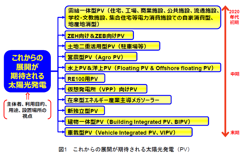 一方メガソーラーは、経済合理性が真っ先に問われるので、適地が少なく限定市場となるが、造成費用や系統接続費用があまり発生しない場所、在来型発電所代替、RE100の実現に必要な太陽光発電所の新設などが想定される。さらに、2010年代後半に新規市場として芽生えた水上設置や営農型太陽光発電(ソーラーシェアリング)などが、関係省庁の規制緩和や導入支援により実績を積み重ねることで成長が見込まれる。また、利用領域を広げる技術開発の進展により、独立型電源市場、車載市場、建物一体型市場も2025年以降に期待できよう。このように、太陽光発電システムの2020年代の利用展開は、図1に示すように様々な分野に広がり、社会に浸透していくことが見込まれる。