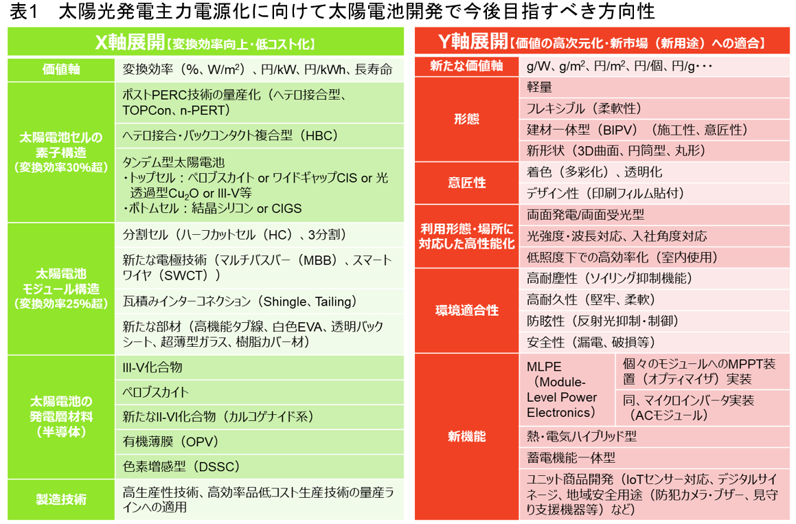 先月の視点では、太陽光発電は2050年に向けて利用形態は段階的に進化(PV0.0⇒PV5.0)することを予測したが、その心臓部となる太陽電池の目指すべき技術開発の方向性は表1に示すように、X軸とY軸の二次元的展開が求められてくる。主力電源化を目指していた2015年以前では、X軸として変換効率向上とコスト化を徹底的に追求することが必要条件として要求されていたが、主力電源として位置付けられている今日では、さらに新たな価値、形態、意匠性、高性能性、環境適合性、機能性など、利用を追求するY軸への展開が十分条件として要求される。