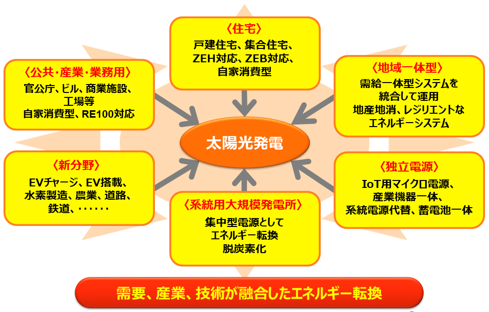 太陽光発電は、今後、技術開発を通じて発電規模、市場、価値基準、利用形態、利用領域の多様化と高度化が進んで行き、図1に示すように、太陽光発電は最も身近なエネルギーとして、あらゆる場面に登場し、社会に溶け込んでいくことになろう。
