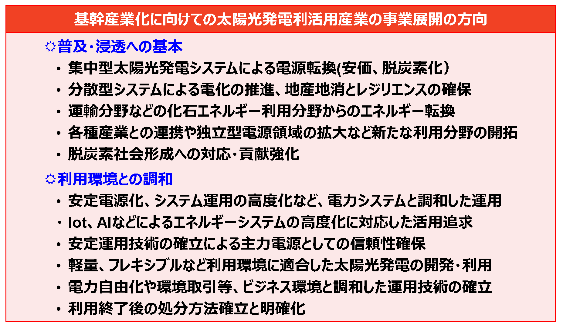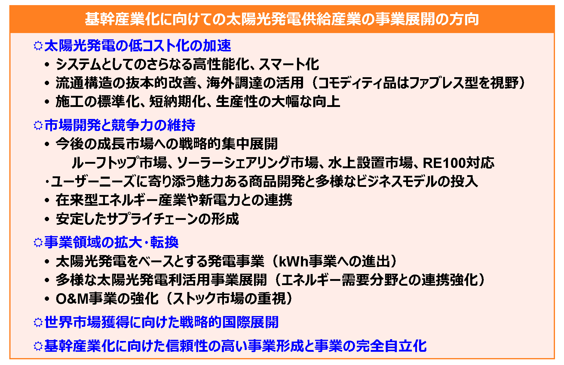 以上のような再エネ型経済社会の創造に向けては、実際にそれを事業として広げていく産業界の強い取り組みが絶対条件となる。太陽光発電は、水力、風力とともに今後の我が国の再エネ立国を支える重要な再生可能エネルギーである。太陽光発電産業を支える分野は、太陽光発電を供給する産業と太陽光発電を利活用する産業に大別される。前者は、日本はかつて世界一であったが、今は大きく後退し、世界との厳しい競争にさらされている。後者はこれから大きく伸びていく新たな産業領域である。太陽光発電の主力電源化は、これからが本格展開の幕開けを迎え、供給と利活を担う双方の連携による産業形成が基軸となる。両分野からなる太陽光発電産業界は、2020年代を大きなチャンスと捉え、産官一体となった基幹産業化を目指し、図1、図2に示すような事業展開を進めていくことを期待する。日本は再エネ型経済社会国家として、再び世界をリードしていこう。