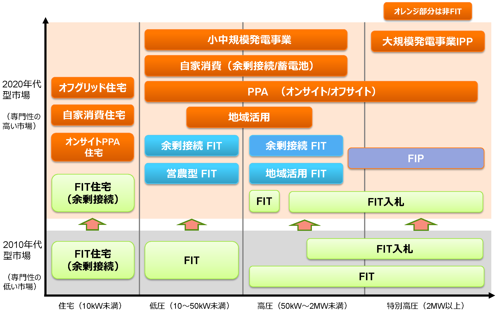 2020年代に入って、太陽光発電の利用拡大は売電ベースのメガソーラー発電から、需給一体型や地産地消型発電としての利用に移ろうとしており、経済性でも太陽光発電設備の価格低下により、電力系統からの購入電力よりも安価に発電できる環境が整い始め、自家消費システムとして経済合理性に基づく導入が可能になろうとしている。このような状況から、2020年代の市場セグメントのイメージは図2に示すように、2010年代のFIT中心市場から新たなFIT及びFIP市場、あるいは支援不要の自立市場へと移行し、事業環境は大きく変貌する。今後は、電力需要家による積極的な太陽光発電導入や、再エネ電力調達の拡大が見込まれることから、太陽光発電産業もFIT制度に依存する2010年代型事業展開から抜け出し、世界からの機器調達、流通合理化、施工短期化、金融手法の活用等を組み合わせた経済合理性の高い、新たなビジネスモデルを生み出し、これからの成長市場となる自家消費型、PPAモデル(オンサイト/オフサイト)などの自立したビジネス展開の構築を急がねばならない。