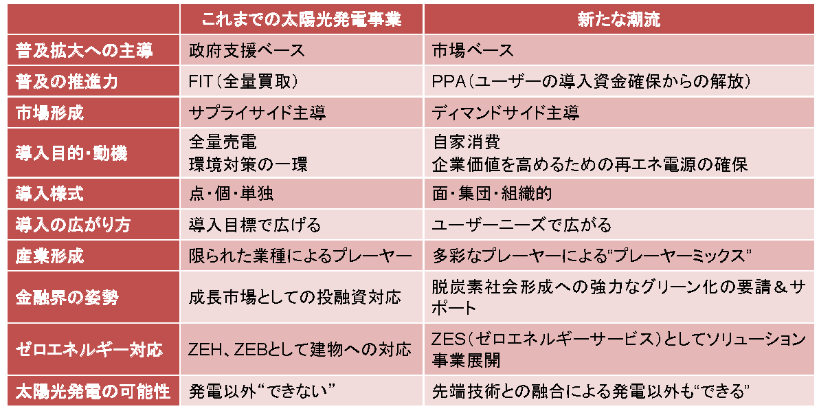 こうした新たな制度への移行により、太陽光発電をめぐる事業環境は、専門性の問われる段階へと進展することとなる。太陽光発電産業界は、このような変化に対する準備を進めてきており、さらに、菅首相による昨年10月の2050年カーボンニュートラル宣言があり、太陽光発電をめぐる事業展開には新たな潮流が芽生えている。この背景には、再エネを主力電源とするエネルギー政策の転換、国際価格を視野に入れた太陽光発電の継続的なコストダウン誘導、金融業界や電力需要家側からの再エネ電力利用への強力なアプローチが、相乗的に進んできたことが挙げられる。具体的には表1に示すように、普及拡大への主導、普及の推進力、市場形成、導入目的・動機、導入様式、導入の広がり方、産業形成、金融界の姿勢、ゼロエネルギー対応、太陽光発電の可能性の視点から見ると、これまでのエネルギー政策や環境政策による政府支援一辺倒の段階を卒業し、市場、産業、需要家をベースとする、新たな考え方や体制に移行しようとしている。