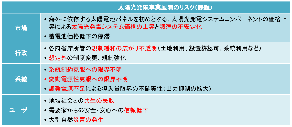 市場面では太陽電池パネルを初め、太陽光発電システムコンポーネントに対する海外依存度が増しており、価格上昇と調達の不安定化のリスクが存在する。さらに、太陽光発電の成長に欠かせない蓄電池価格の低減が進まないと、導入拡大は限定的となる。政策面では、各府省庁が所管する土地利用、設置許認可、系統利用などの規制緩和が進もうとしているが、どこまで広がるかが不透明である。電力系統面では、系統制約や変動電源性の克服、調整電源不足による導入量抑制など、系統に関わる受け入れ限界のリスクが想定される。ユーザー面では、地域社会との共生の失敗、事故による安全・安心への信頼性低下、大型自然災害の発生など、ユーザーからの離反リスクが考えられる。このような今後の太陽光発電の発展を左右するリスクに対しては、太陽光発電産業だけで解決できるものではなく、政府を含め関係業界との連携を深めながら、太陽光発電事業展開へのリスク低減対応も怠ってはならない。太陽光発電は2050年カーボンニュートラルを主導していく、すでに確立された技術であるので、産官学金による総力戦で、供給面、需要面、行政面、技術面、金融面から100GWを超える導入に対する体制整備に、今から取り組んでいこう。