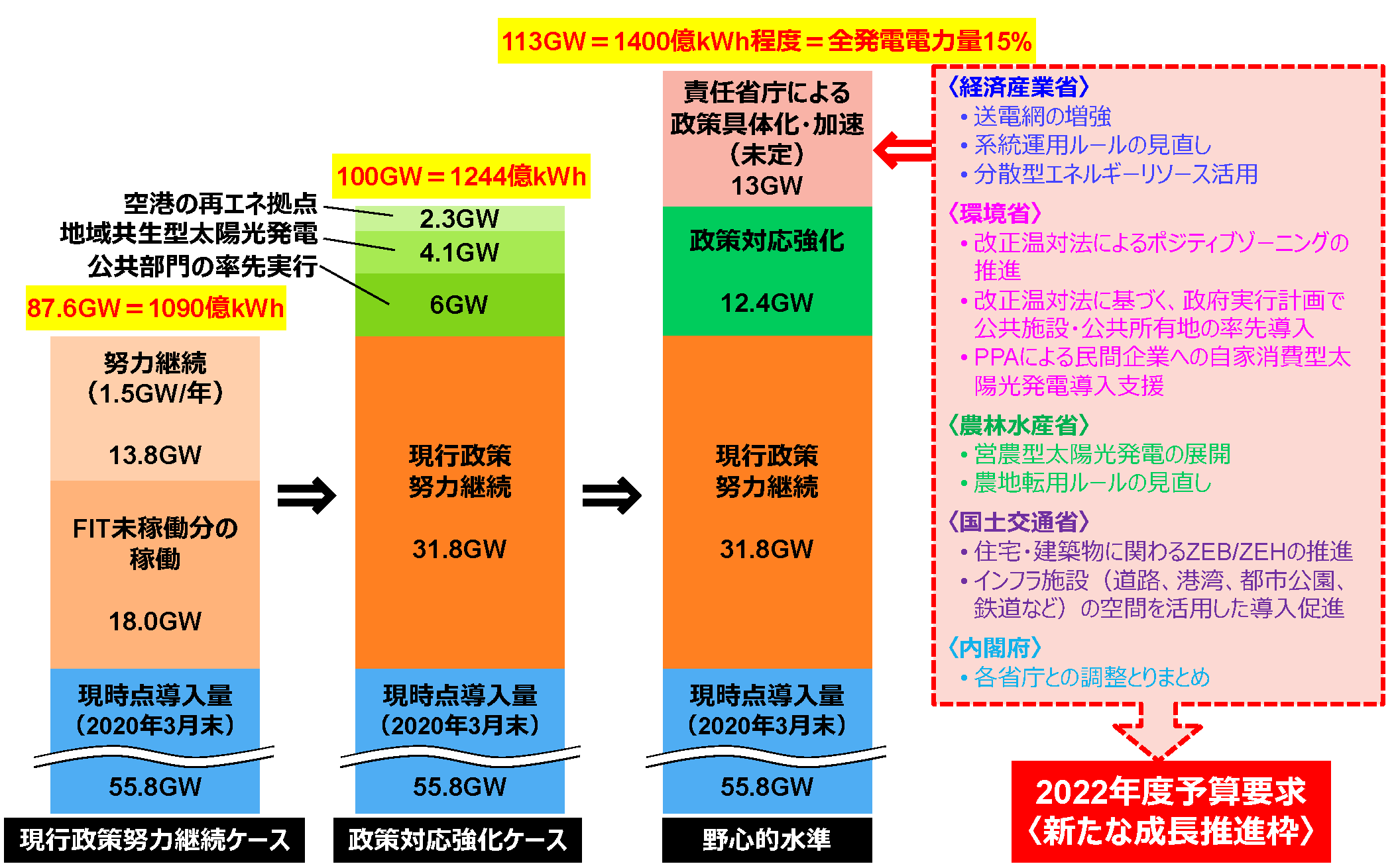 関係府省庁は、すでに、2022年以降の再エネに向けての施策立案や規制改革を進めており、施策を推進するための新たな予算も2022年度の予算要求の中に盛り込んでいる。第6次エネルギー基本計画と新地球温暖化対策計画を新たな発射台にして、現在構築されつつある関係府省庁との連携による“責任省庁を軸とする太陽光発電導入拡大”を明確にし、一過性のものとせず定着、強化していくことが市場拡大の予見性を高め、100GWを超える導入は“野心的”ではなく“現実”のものとなる。太陽光発電産業も2030年温室効果ガス46%削減を支える中心的な“責任産業”としての役割を担い、市場面、コスト面、技術面から総力を挙げて目標達成にとりかかろう。太陽光発電の野心的水準の達成は、2050年カーボンニュートラルの試金石である。