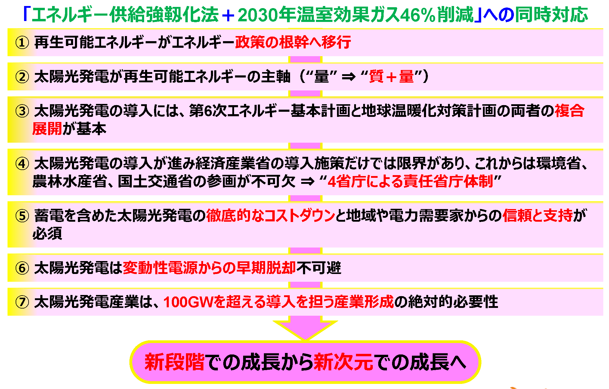 第6次エネルギー基本計画と地球温暖化対策計画が閣議決定されると、再生可能エネルギーは政策対応として、地域と共生する形での適地確保、事業規律の強化、コスト低減、市場への統合、系統制約の克服、規制の合理化、技術開発の推進が一気に進んでいくこととなる。今回の野心的水準への実現は、責任省庁として経済産業省を軸に環境省、農林水産省、国土交通省が加わることとなり、わが国の普及の構造変化が始まる。普及への責任体制が1省から4省に広がり、各省庁が所管する法律、施策、規制措置、予算を結集・駆使することで、これまで普及の進まなかった分野・場所での導入拡大が可能となる。さらに、環境省が主導する地方自治体による導入展開が始まれば、全国に浸透させることもできる。一方、太陽光発電産業はコストダウンと需要家からの支持を図りながら、市場形成、事業形成、プレーヤー形成、システム形成を進めるならば、“責任産業”として普及拡大の役割を産業面から担うことができる。PPA方式によるビジネスモデル、ESG金融の加速、再エネ電力への切り替えという新たな市場環境も生まれている。太陽光発電産業は、カーボンニュートラル社会にチェンジしていくために、電源として質と量の向上を同時に両立する新次元での成長という大きなチャンスと発展に総力を挙げ、責任省庁とともに2030年太陽光発電電力14~16%必達に向けて、最大限のチャレンジを図っていこう。