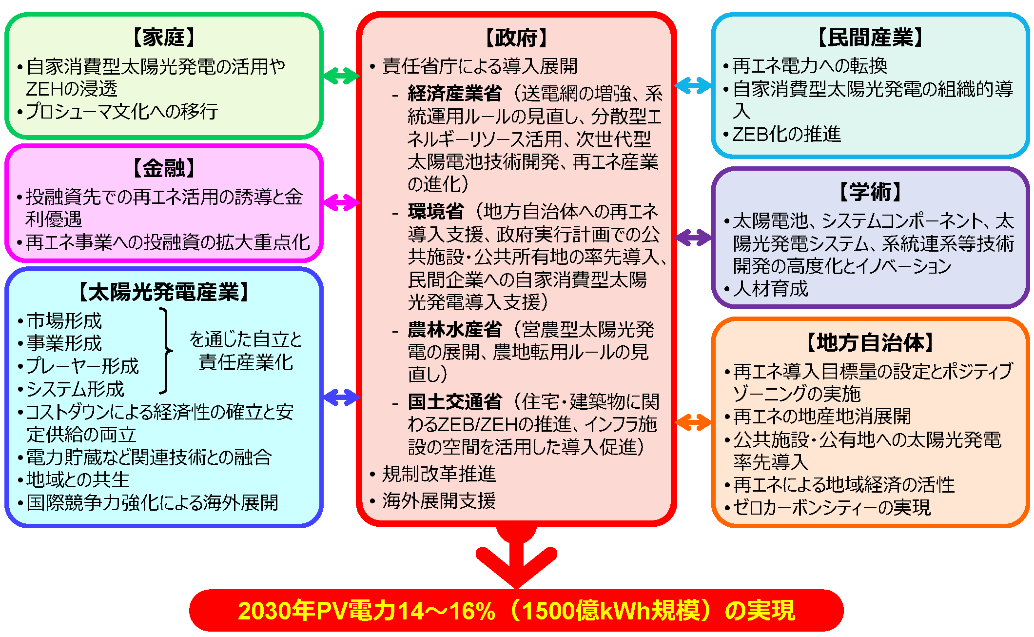 さらに、117.6GWという2030年の野心的な導入目標量達成には、政策総動員に加えて太陽光発電及び関連産業、地方自治体、金融はもとより、産業や家庭など電力需要家からのアプローチも欠かせない。関係省庁による責任にとどまらず、政府が軸となって各サイドそれぞれが役割を分担することが求められる。国を挙げて図1に示すような目標達成へのスクラムを組んで、FITに勝る強力な“普及の力”を生み出し、国民運動的な普及行動へと進展すれば、2030年目標は野心的ではなく現実的なものとなろう。特に、太陽光発電産業は“責任産業”として、市場形成、事業形成、プレーヤー形成、システム形成を通じて産業基盤の強化を図るとともに、普及拡大をめぐる責任省庁との連携を深めていかねばならない。太陽光発電産業は、太陽光発電システム新規導入の事業展開だけでなく、すでに運用が始まっている太陽光発電システムの維持・管理事業や、電力貯蔵分野とも連携した太陽光発電電力供給事業へとカバーする事業領域を広げ、2030年までに年間1500億kWh規模の電力を安定供給できる産業形成を目指すべきである。