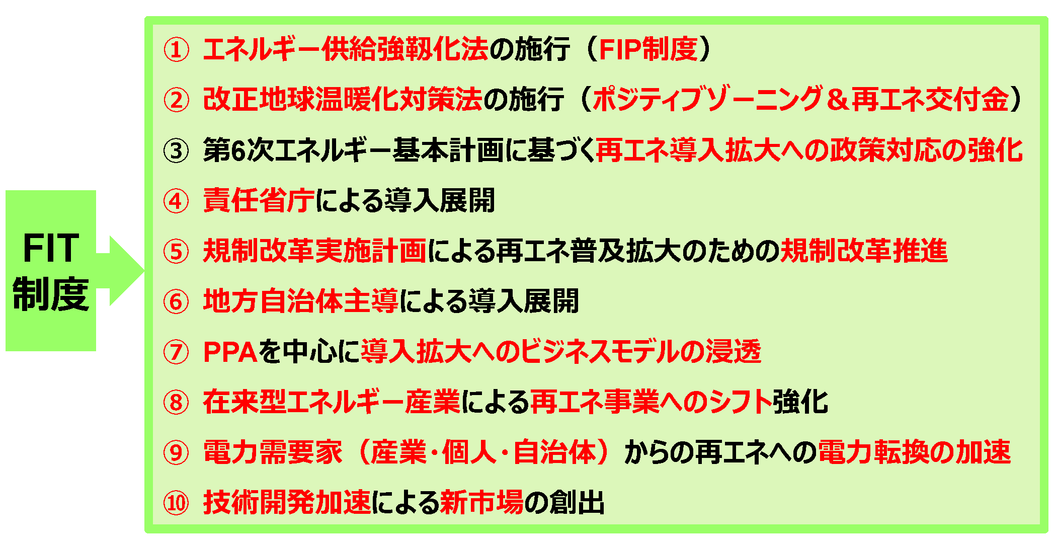 具体的には、2022年からの太陽光発電の普及構造には以下のような変化が始まろう。エネルギー供給強靱化法の施行では、再エネ促進法および電気事業法に基づいて、これまでの固定買取制度FITに代わって、市場連動型のFIP制度、太陽光発電に係る破棄費用積立制度、認定失効制度、プッシュ型送電網増強、配電事業や特定卸供給事業者(アグリゲーター)へのライセンス導入等が開始される。改正地球温暖化対策法の施行では、自治体による再エネ導入目標量や再エネ普及促進区域の設定を通じて、太陽光発電システムの導入拡大が始まる。第6次エネルギー基本計画に基づく政策対応では、再エネ最大限の導入に向けて、適地確保、事業規律の強化、コスト低減、電力市場への統合、系統制約の克服、規制の合理化、技術開発の推進の一層の強化が図られる。責任省庁による導入展開では、経済産業省、環境省、国土交通省、農林水産省それぞれが所管する法律、制度、施策、予算、規制改革を総動員して、公共施設、住宅、産業施設、農地等の分野でGW規模の導入がそれぞれ進められていく。規制改革では、2021年度の規制改革実施計画に基づいて、関係府省庁及び自治体にまたがる規制や阻害要因を総点検し、太陽光発電の導入拡大につながる規制改革が続けられる。地方自治体による導入展開では、地域脱炭素ロードマップや導入目標量の設定に基づいて、再エネ交付金等の導入補助を利用しながら、地域での地産地消型の太陽光発電システム導入拡大が本格化していく。さらに、導入拡大へのビジネスモデルでは、第3者所有モデルによる導入設置費用の発生しないPPA方式の導入を初め、普及拡大へのビジネスモデルを浸透させることで、政府支援を不要とする普及が進んでいく。在来型エネルギー産業による再エネ事業へのシフト強化では、再エネ供給プレーヤーとなることで、エネルギーの安定供給と再エネ産業への信頼を深めていく。電力需要家からの再エネへの電力転換の加速では、再エネ電源開発投資が進み、普及拡大を需要サイドが主導していくこととなる。技術開発の加速では、これまでは太陽光発電の導入の進まなかった分野での導入が可能となり、新市場創出による導入領域が広がっていく。